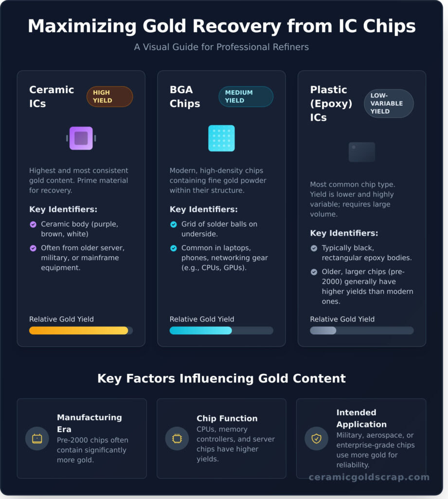 - Plastic ICs: The gold yield from plastic ICs is much lower and more inconsistent. Processing them requires handling large volumes to achieve a profitable return. (Note: Verify specific yield data from industry sources before purchase).